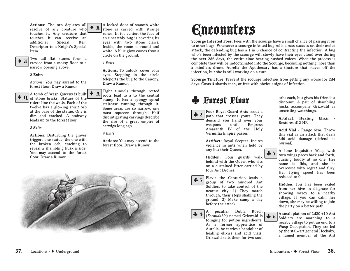 You can use the procedures in this book to build Litterfall at the table. Of if you prefer, you can use the same procedure to generate encounters ahead of time. Additionally, if you are creating your own world, you can take details and inspiration from this text and sprinkle them into your setting.